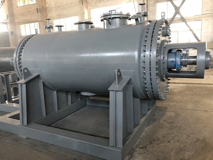被干燥物料從殼體上方正中間加入,在不斷正反轉(zhuǎn)動的耙齒的攪拌下,物料軸向來回走動,與殼體內(nèi)壁接觸的表面不斷更新,受到蒸汽的間接加熱,耙齒的均勻攪拌,粉碎棒的粉碎,使物料內(nèi)的水份氣化,在真空系統(tǒng)的作用下,使被干燥物料內(nèi)部水份和表面水份有利的排出,氣化的水份經(jīng)干式除塵器、濕式除塵器、冷凝器,從真空泵出口處放空。